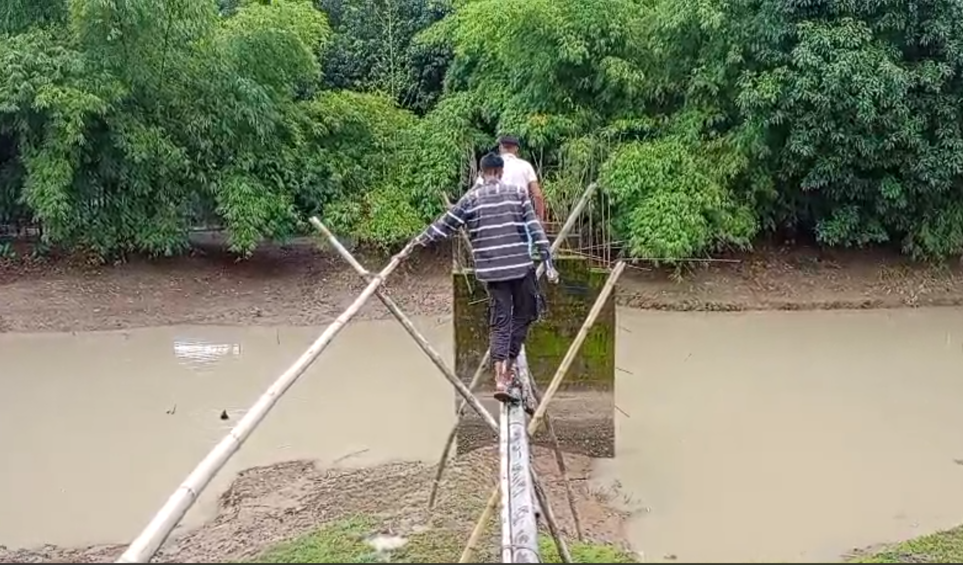 আধুনিক যুগেও ঝুঁকিপূর্ণ বাঁশের সাঁকো দিয়ে পারাপার—বরাকের উন্নয়নের বাস্তব চিত্র ফুটে উঠলো কাছাড়ে। এখনো গ্রামাঞ্চলের বহু এলাকায় জনগণের যাতায়াতের জন্য ন্যূনতম সুবিধাটুকুও নেই। যার দরুন স্বাধীনতার এত বছর পরও কাছাড়ের বড়খলা-চান্দপুরে শত শত পরিবারের যাতায়াতের সম্বল একমাত্র বাঁশের সাঁকো। এমনিতেই বড়খলার জনগণের সমস্যার শেষ নেই—রাস্তাঘাট থেকে শুরু করে নদী ভাঙনের মতো সমস্যা জেরবার করছে বৃহত্তর এলাকার মানুষকে। জনগণের ভোটে নির্বাচিত জনপ্রতিনিধিদের প্রতিশ্রুতিতে আশায় বুক বেঁধেও উন্নয়নের কাজ চোখে পড়ছে না বলে অভিযোগ স্থানীয়দের। নির্বাচন এলেই উন্নয়নের স্লোগান, এরপর আর তেমন সাড়া মেলে না—এমন অভিমান ভেসে উঠছে গ্রামবাসীর কথায়। বড়খলার বিজয়পুর আনোয়ারপারের সেতুর পর এবার নবগঠিত চান্দপুর জিপিতেও এক ঝুঁকিপূর্ণ সেতুর চিত্র সামনে এলো। অভিযোগ মতে, প্রায় ৭/৮ বছর আগে গ্রাম উন্নয়ন বিভাগ থেকে প্রায় ১৪ লাখ টাকা বরাদ্দ হয়েছিল সেতু নির্মাণের জন্য। কিন্তু মাঝপথে কাজ বন্ধ হয়ে যাওয়ায় আর শেষ করা হয়নি। ফলে বিপাকে পড়েছেন স্কুল কলেজের শিক্ষার্থী থেকে শুরু করে অসুস্থ রোগীরাও। যদিও সেতু পুনর্নির্মাণের জন্য বিধায়কের কাছে আবেদন জানানো হয়েছে, তবে আজও তেমন কোনো সুরাহা হয়নি বলে দাবি স্থানীয়দের। অবশেষে, তারা ক্ষোভ প্রকাশ করেছেন দীর্ঘদিন ধরে উন্নয়নের কাজ থমকে থাকায়।